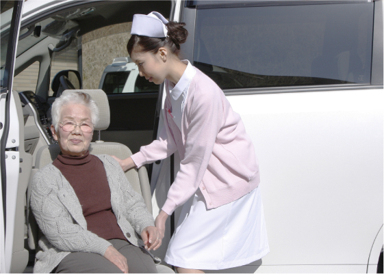 利用者の方を、入口でお見送りをして福祉車両でご自宅まで送迎致します。